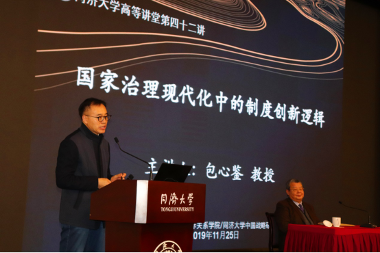 Hosted by the Institute for China & World Studies and the School of Political Science & International Relations (SPSIR) of Tongji University, the Tongji Serial Lectures on Social Sciences No.20 & the Tongji Advanced Lectures for Graduate Students No.42 was successfully held in the lecture hall on the first floor of Yifu Building, Siping Campus, Tongji University on November 25, 2019. Professor Bao Xinjian, Vice President of the Chinese Association of Political Science, former Deputy Secretary of the Leading Party Members' Group and Vice President of Shandong Federation of Social Sciences, a distinguished professor of Shandong University, and Honorary Dean of the School of Political Science and Law at University of Jinan, was invited to give a speech on the topic of "The Logic of Innovation in the Modernization of China’s System and Capacity for Governance". Professor Men Honghua, Dean of SPSIR, moderated this lecture.